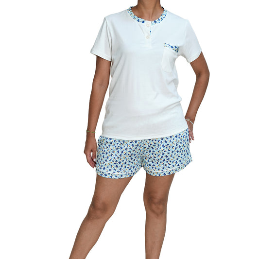 Pijama de mujer MorfeoHome - Clisoria (verano) crema con short de flores azules