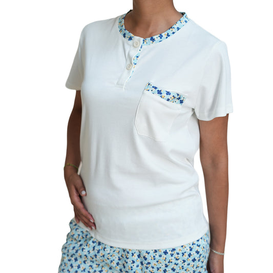 Pijama de mujer MorfeoHome - Clisoria (verano) crema con pantalón de flores azules